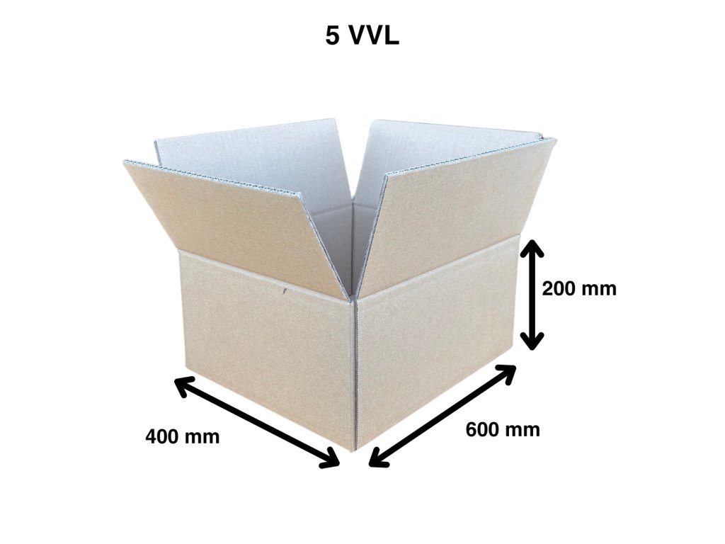 Kartonová krabice nová 5VVL o vnitřních rozměrech 600x400x200 mm. Krabice je nová, bez potisku. Krabice jsou svázané po 20 kusech.
